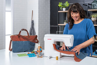 We recommend using a 100 denim needle or a non-stick needle, and three spools of all-purpose thread to match the main, accent, and lining fabrics.