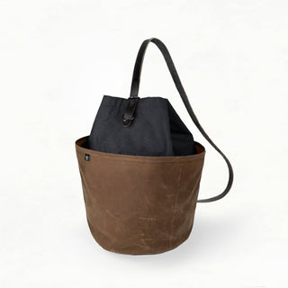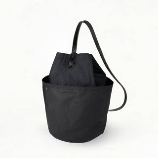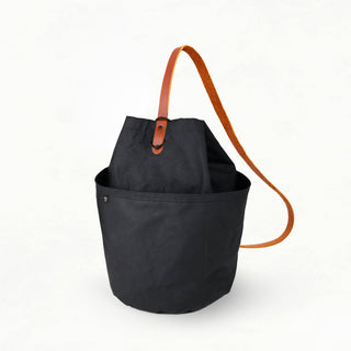 It features a cylindrical body with a sturdy, sit-flat base, 360 degrees of interior and exterior pockets, a magnetic snap rivet, extra-strength tubular rivets, and a clever closure that cinches into elegant pleats with the pull of a strap.
