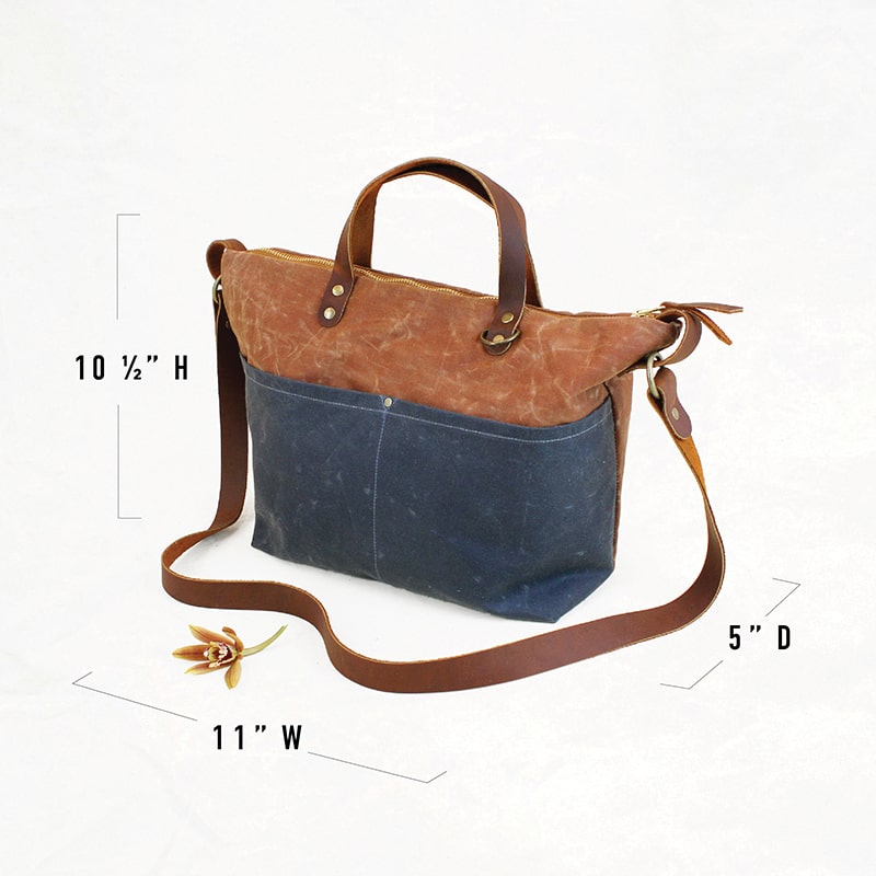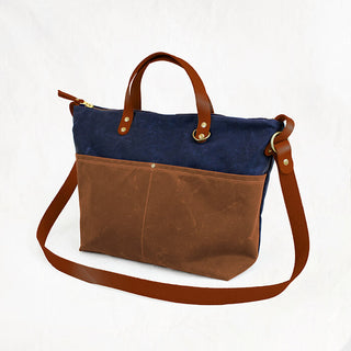 This kit includes a Pendleton® wool pocket, waxed canvas, pre-cut leather, hardware, a paper large format pattern (to cut your fabric out), and access to the PDF pattern. You have the option to add tools, supplies, and a paper instructions booklet.