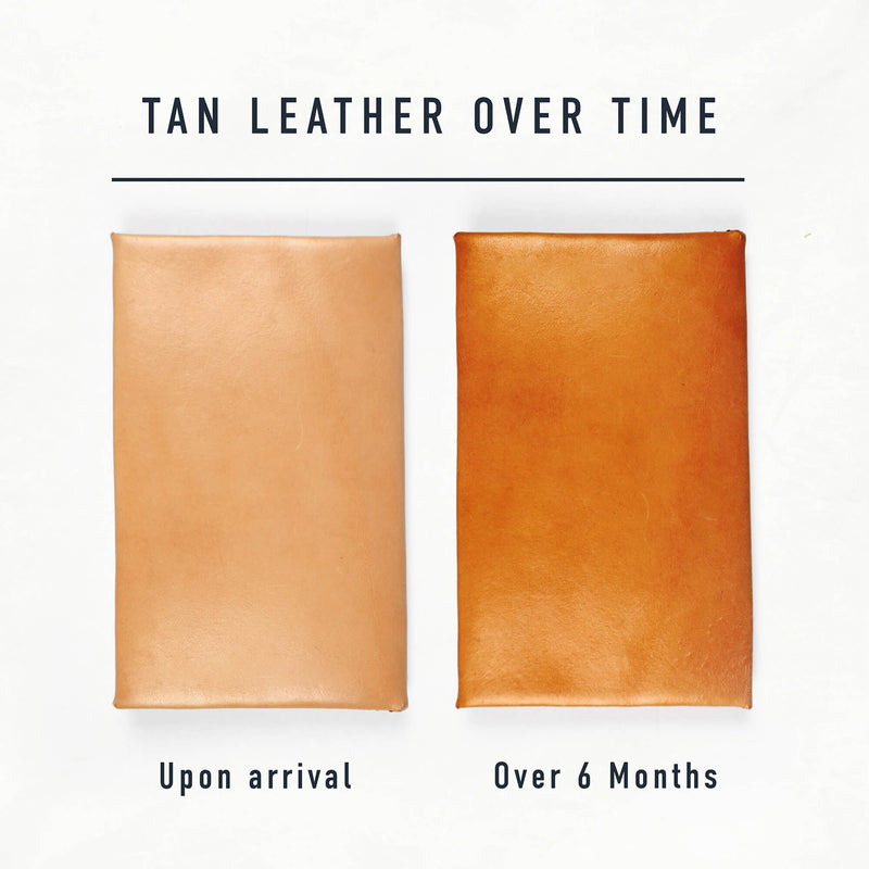 Our natural, vegetable tanned leather might feel a bit stiff at first, but it will soften nicely with use. The light tan color will also darken to a lovely caramel brown with time due to sun exposure and natural oils from your hands.