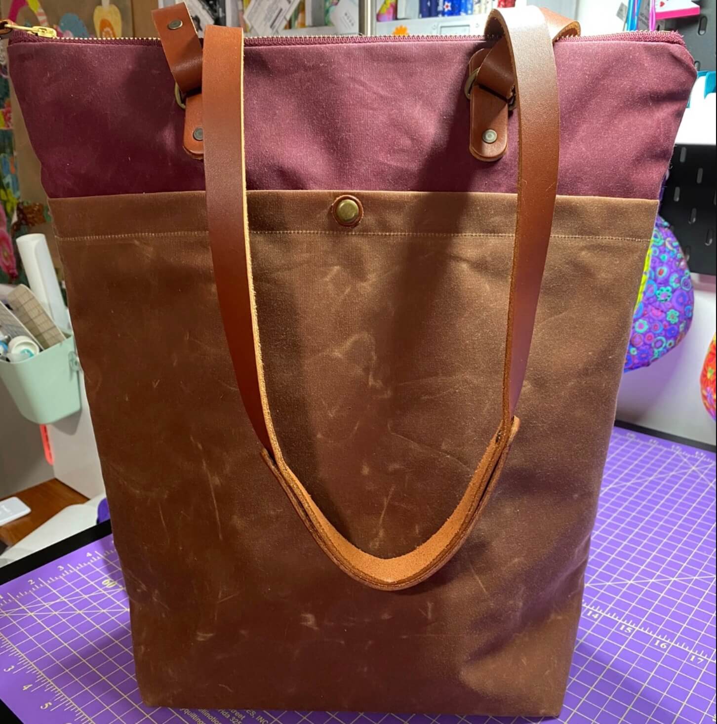 This kit includes waxed canvas fabric, natural canvas lining, pre-cut leather, hardware, a full-size paper pattern, PDF instructions booklet, and full PDF pattern. You have the option to add the online class, tools, and paper instructions booklet.