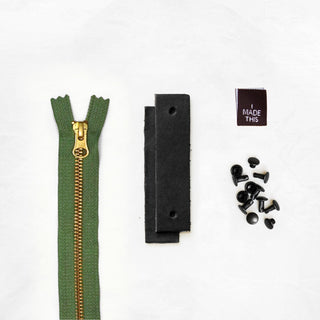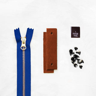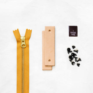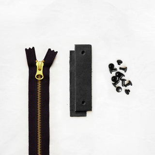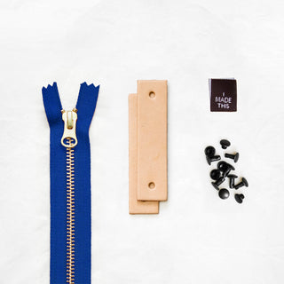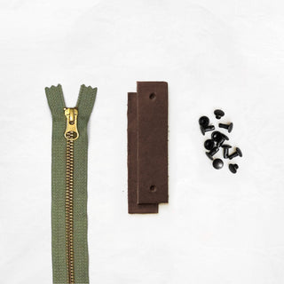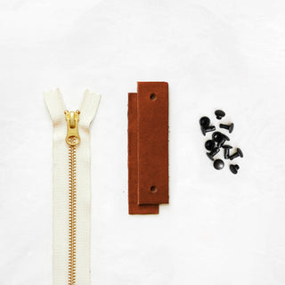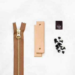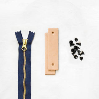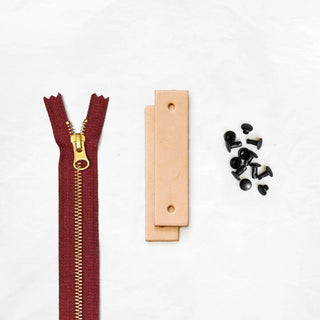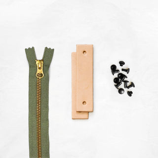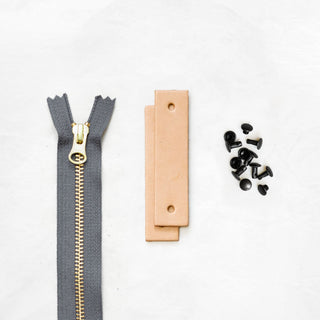 - Pre-cut and hole-punched leather tabs + zipper pull