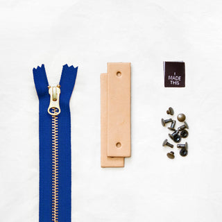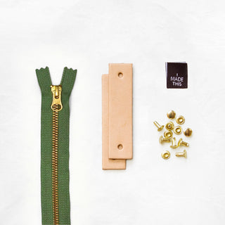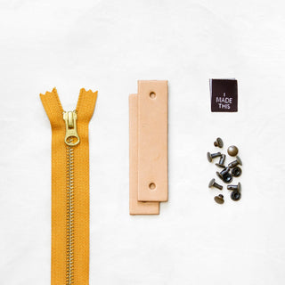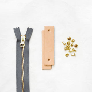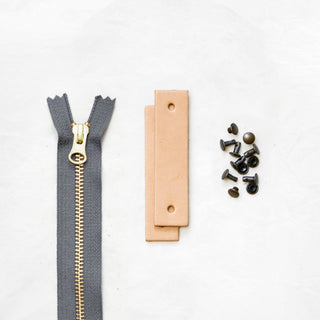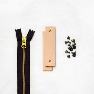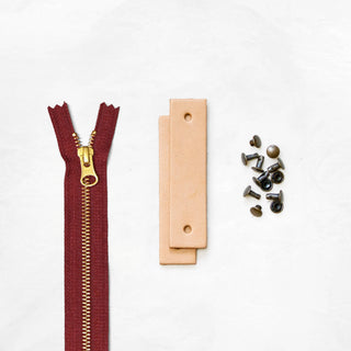 - Pre-cut and hole-punched leather tabs + zipper pull