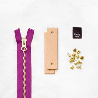 A highly-giftable boxy zipper pouch for carrying essentials while you're on the go. Durable, water-resistant, and spacious enough to keep your personal items organized while traveling. This kit includes all of the leather + hardware needed to make this bag, with the option to add the pattern, online class, and tools below.