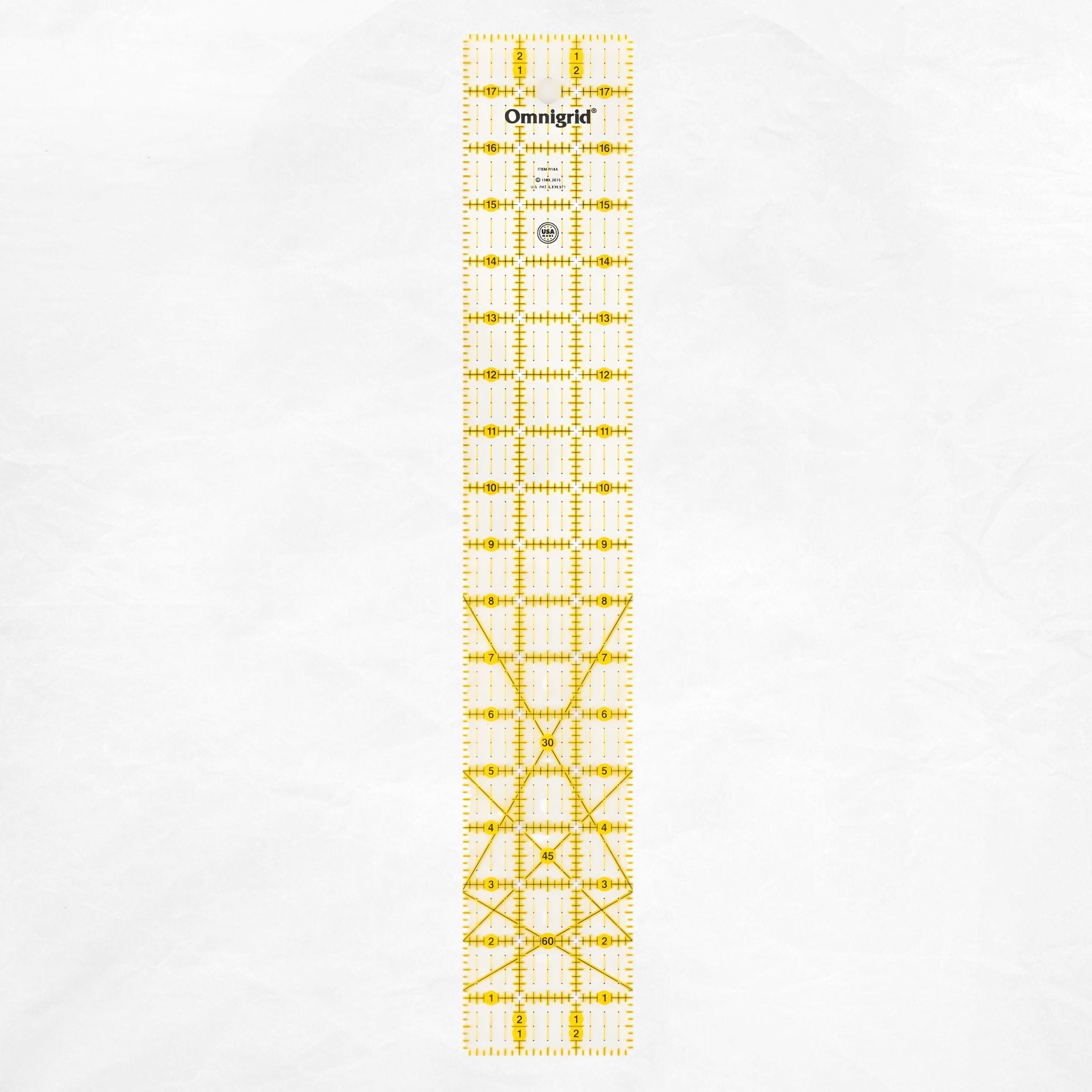 This 3" x 18" quilting ruler by Omnigrid is an essential tool for any bag makerโs studio. This size ruler is our go-to for drafting pattern pieces or drawing guide marks. It is transparent with easy-to-read black lines that are outlined by yellow, a right and left-hand numbering system, and 1/8" markings for precise measurements. Use this ruler with a marking tool or with a rotary cutter on a self-healing cutting mat for cutting fabric and leather.