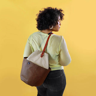 The Naito is a shape-shifting bucket bag that is elegant and utilitarian in equal parts. It features a cylindrical body with a sturdy, sit-flat base, full-circle interior and exterior pockets, a magnetic snap rivet, extra-strength tubular rivets, and clever closure that cinches into elegant pleats with the pull of a strap.