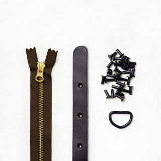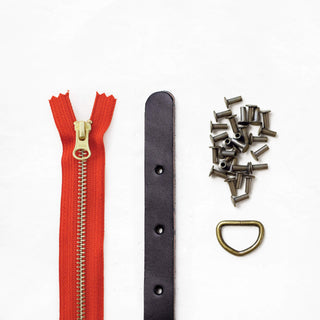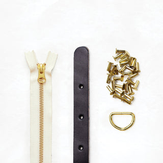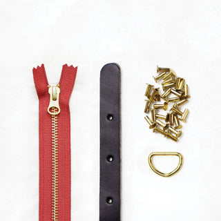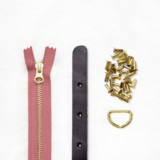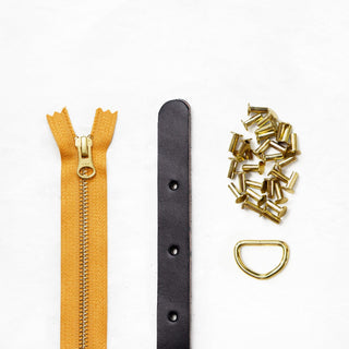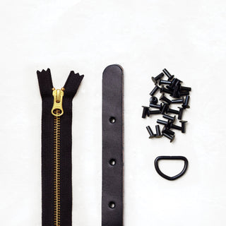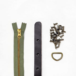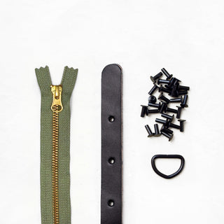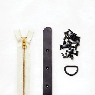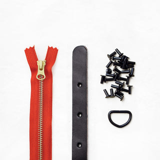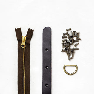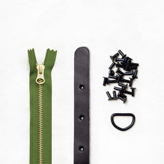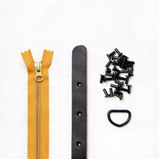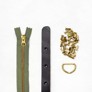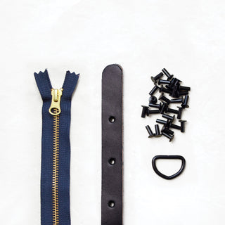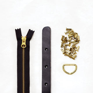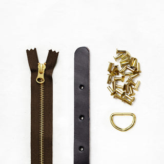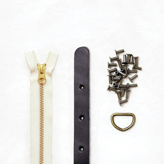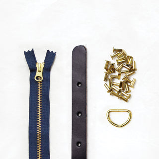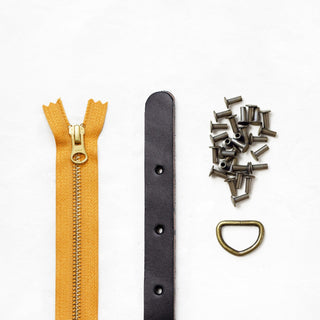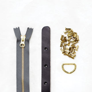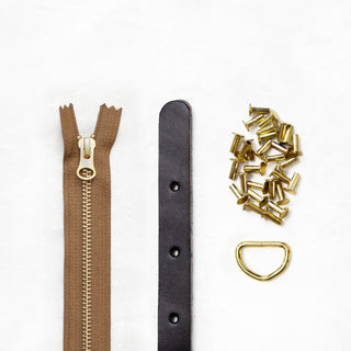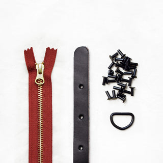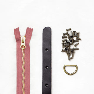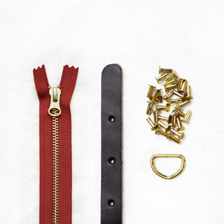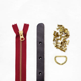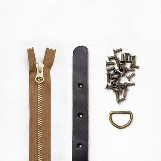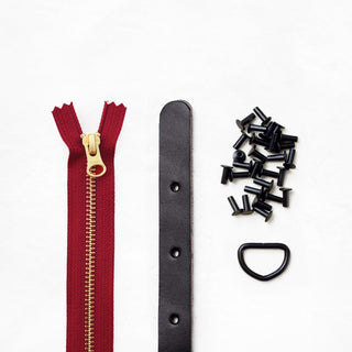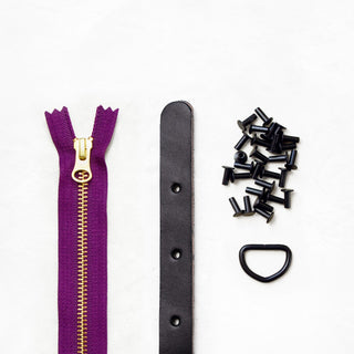 This kit includes pre-cut leather, hardware, and a 14" brass zipper with a large hole in the slider to accommodate the leather zipper pull. You have the option to add on the PDF or paper pattern, online class, and tools.
