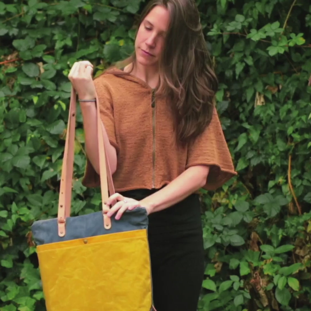 This kit includes waxed canvas fabric, natural canvas lining, pre-cut leather, hardware, a full-size paper pattern, PDF instructions booklet, and full PDF pattern. You have the option to add the online class, tools, and paper instructions booklet.